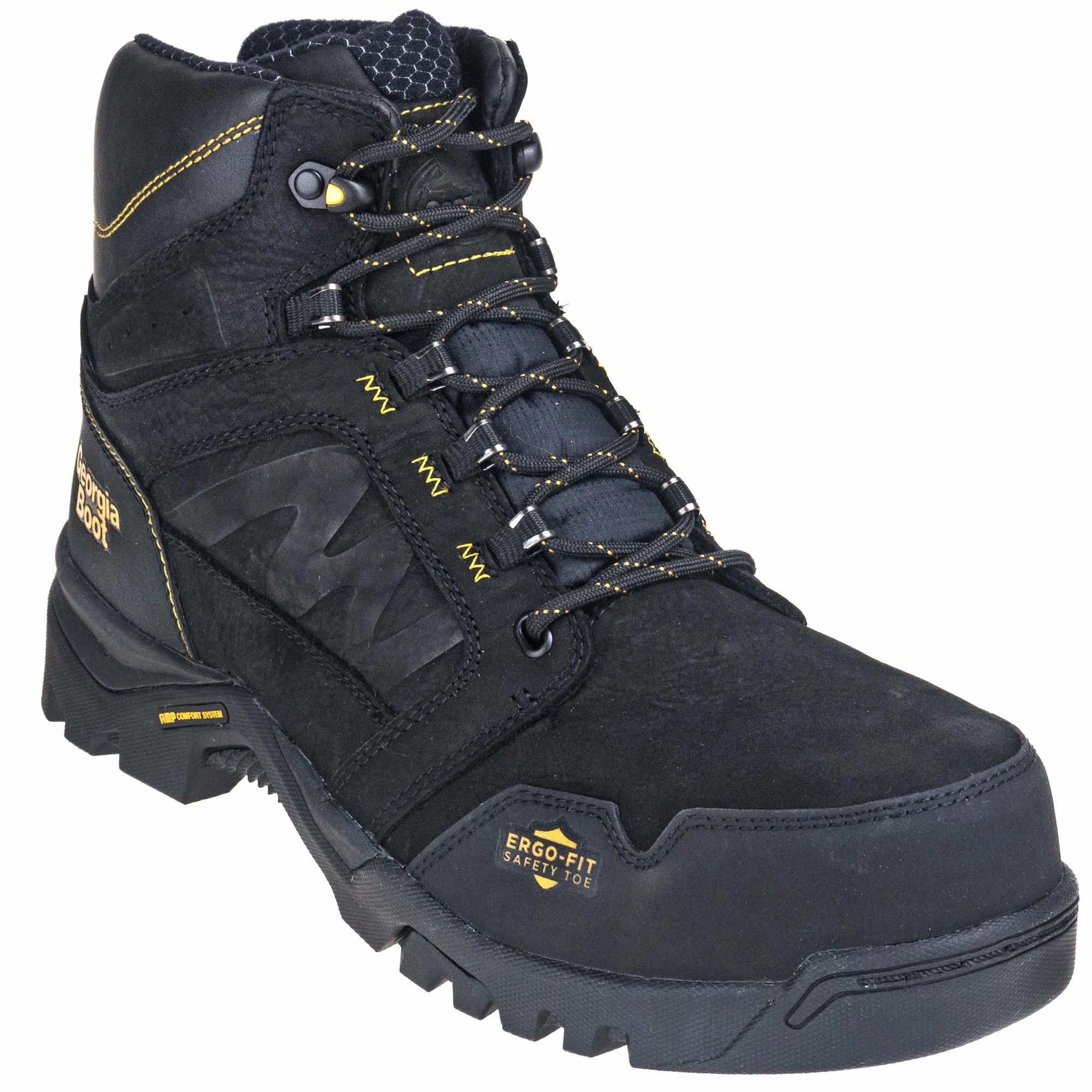 These Georgia men’s waterproof boots have toughness in their make. For starters, a composite toe rounds out the front of each boot. The composite toe qualifies them to meet ASTM standard F2413, which defines the performance requirements protective footwear has to meet to defend you from numerous hazards, including impact (I/75) and compression (C/75). Impact and compression both involve resistance for the toe area. Specifically, these composite toe EH boots are able to withstand up to 75 pounds of drop impact and 75 pounds of pressure while protecting your toes. Electrical shock-resistant protection is another standard associated with protective footwear, and it’s met if the outer surface of the sole and heel can withstand 18,000 volts. These durable 6-inch black boots in particular are able to keep your safe from electricity due to their protective toe caps, which insulate you from ground conduction. Aside from the composite toe and toe caps, these men’s leather boots also include the Georgia Boot® Amplitude’s rubber outsole, which makes them oil- and slip-resistant in addition to keeping you protected from electricity. Also included are durable rubber toes and heels for excellent abrasion resistance.